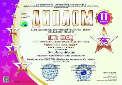 Мектепалды даярлық "Жұлдыз" тобының тәрбиеленушісі: Исагалиева Айзере Көркем сөз оқу номинациясы бойынша 2 жүлделі орын иеленді.